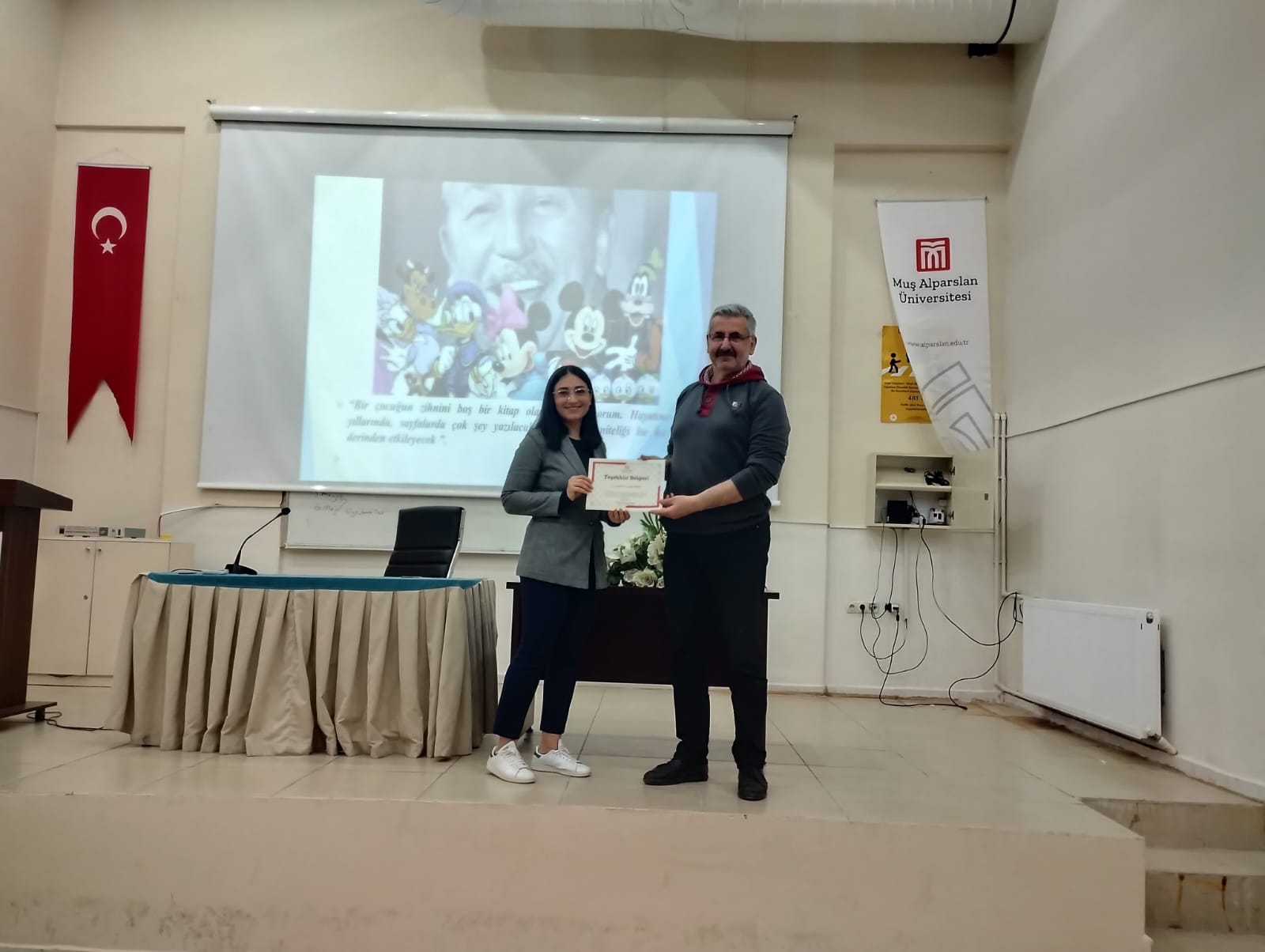 Meslek Yüksekokulumuz Çocuk Bakımı ve Gençlik Hizmetleri Bölümü Çocuk Gelişimi Programı öğretim elemanı Öğr. Gör. Dr. Burcu GÜLEY tarafından çarşamba seminelerleri kapsamında "Çocuk ve Çizgi Filmler" adlı seminer verildi. SHMYO Vali Erdoğan Bektaş Amfisinde düzenlenen programa MYO Müdürümüz Dr. Öğr. Üyesi Özmen İSTEK, akademik personelimiz ve öğrencilerimiz katılım gösterdiler. Seminer sonunda Müdürümüz Dr. Öğr. Üyesi Özmen İSTEK tarafından Öğr. Gör. Dr. Burcu GÜLEY'e teşekkür belgesi verildi.